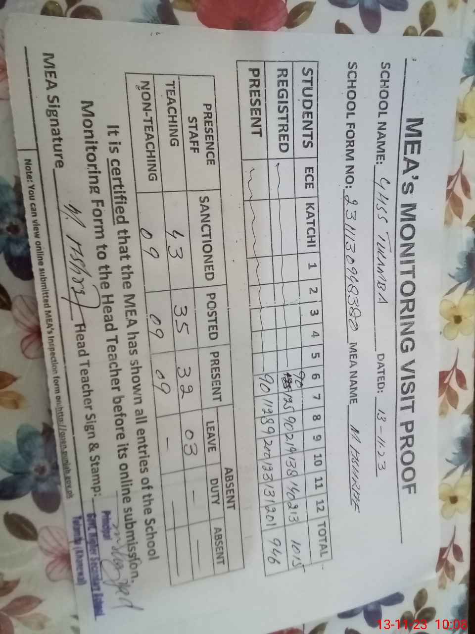 | Certified that this School was Inspected by the Undersigned MEA/DMO Today and the Information Stated Above is as Per Record. | |||||