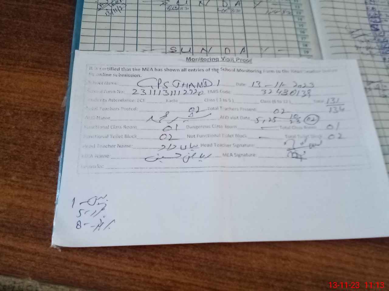 | Attendance Register | Head Teacher | MEA with School | Visit Proof |