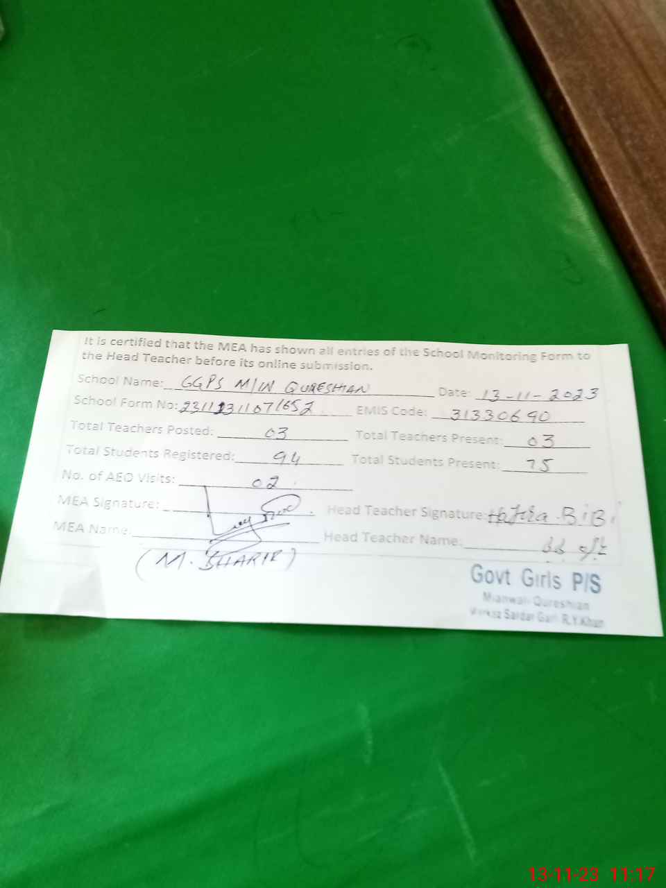 | EMIS Code: 31330690 | Name of School: GGPS MIAN WALI QURESHIAN | |||
