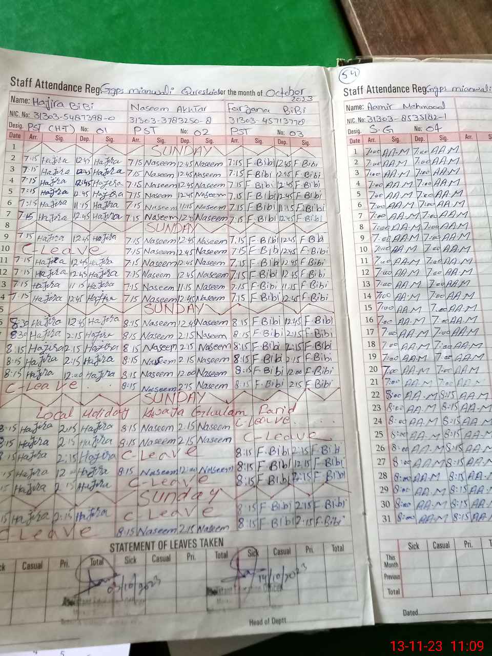 | CNIC | Full Name | Designation | R/C | Absence During Last Calender Month |