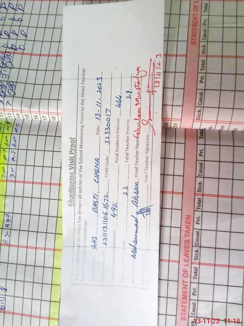 | Attendance Register | Head Teacher | MEA with School | Visit Proof |