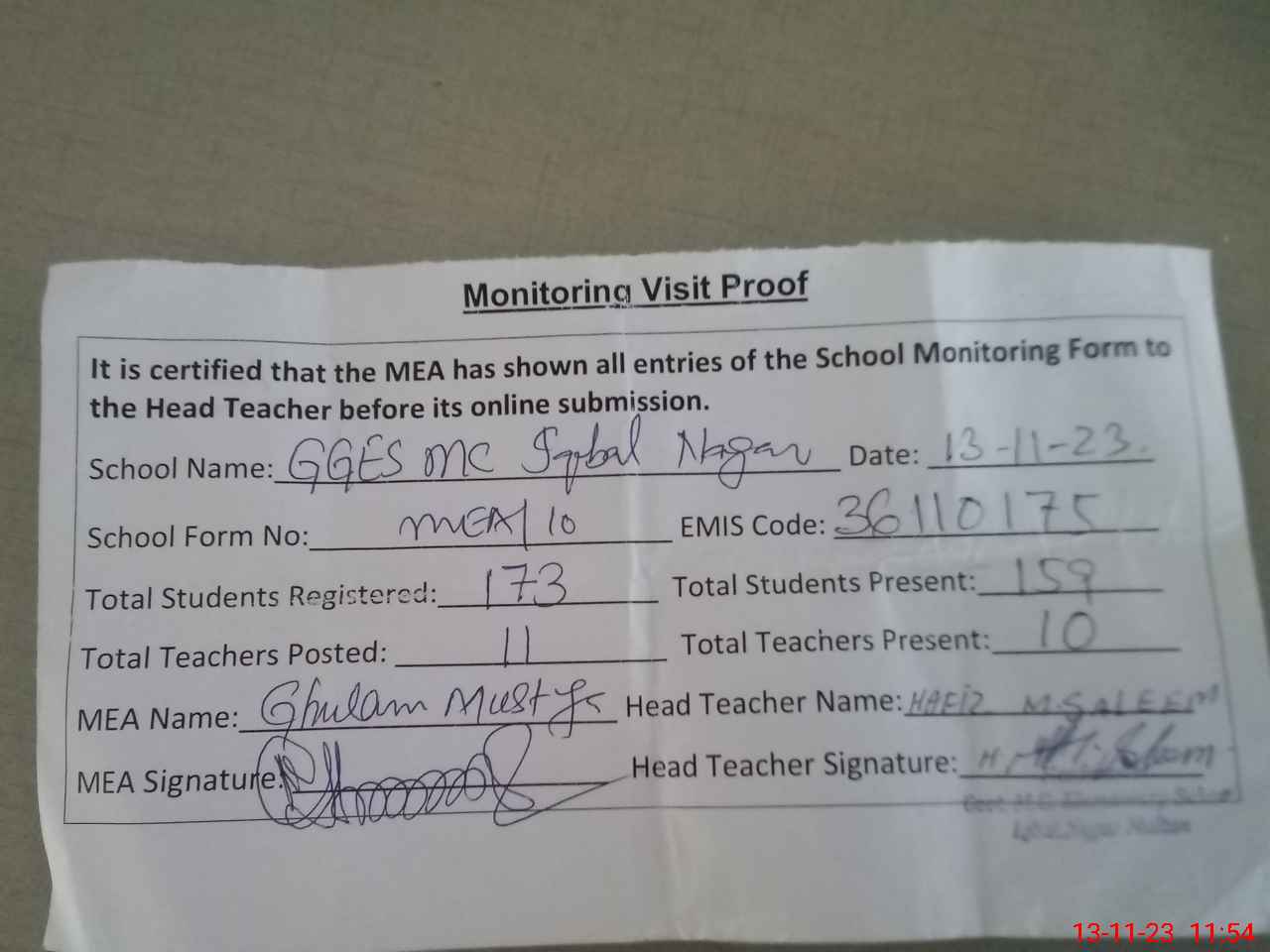 | EMIS Code: 36110175 | Name of School: GES MC IQBAL NAGAR | |||