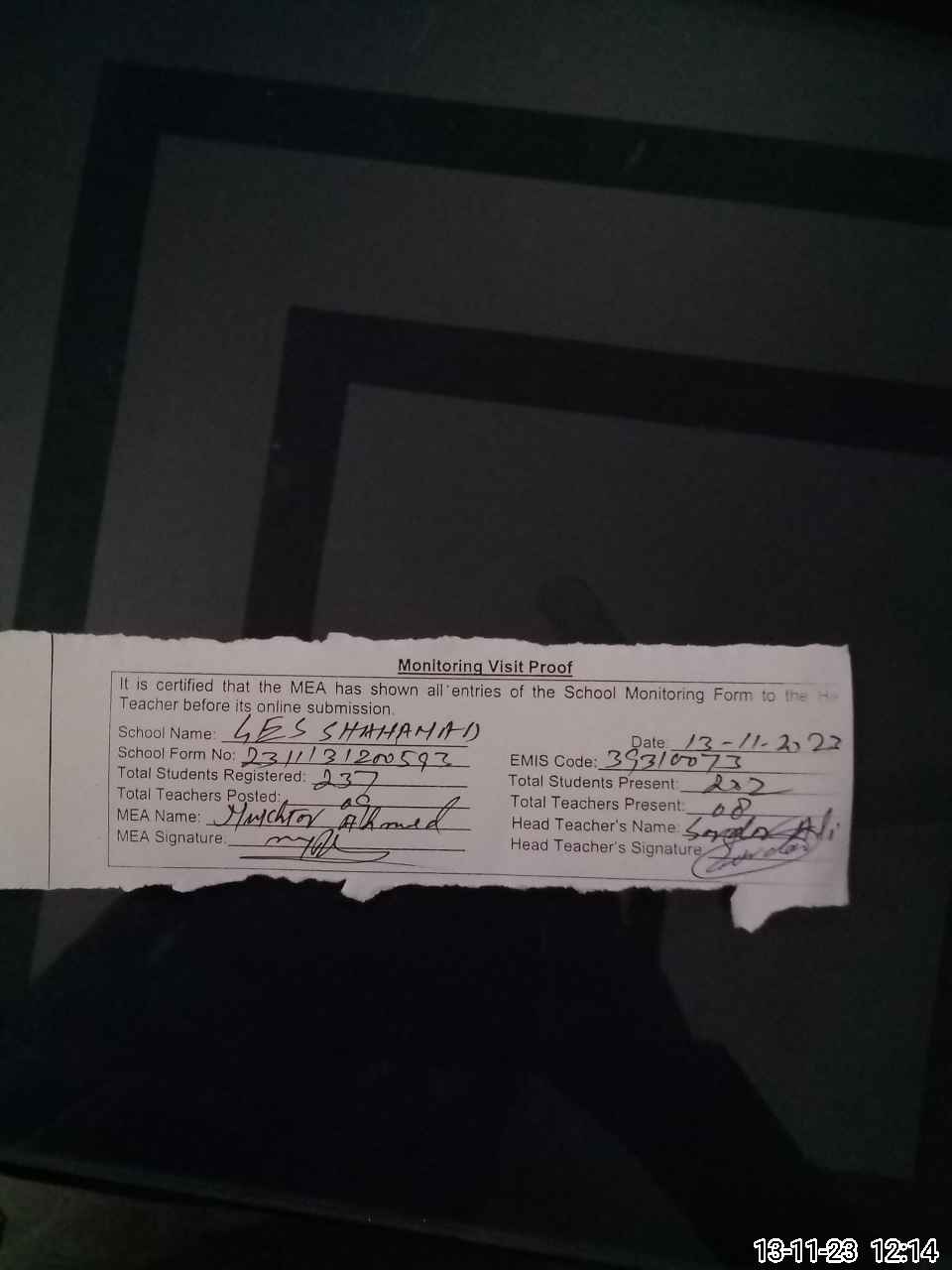 | Attendance Register | Head Teacher | MEA with School | Visit Proof |