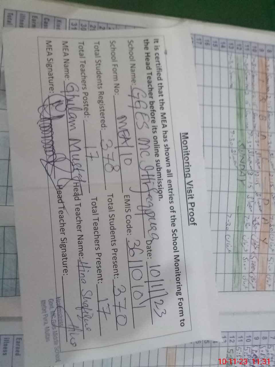| EMIS Code: 36110101 | Name of School: GGES MC ITTEFAQ PURA MULTAN | |||
