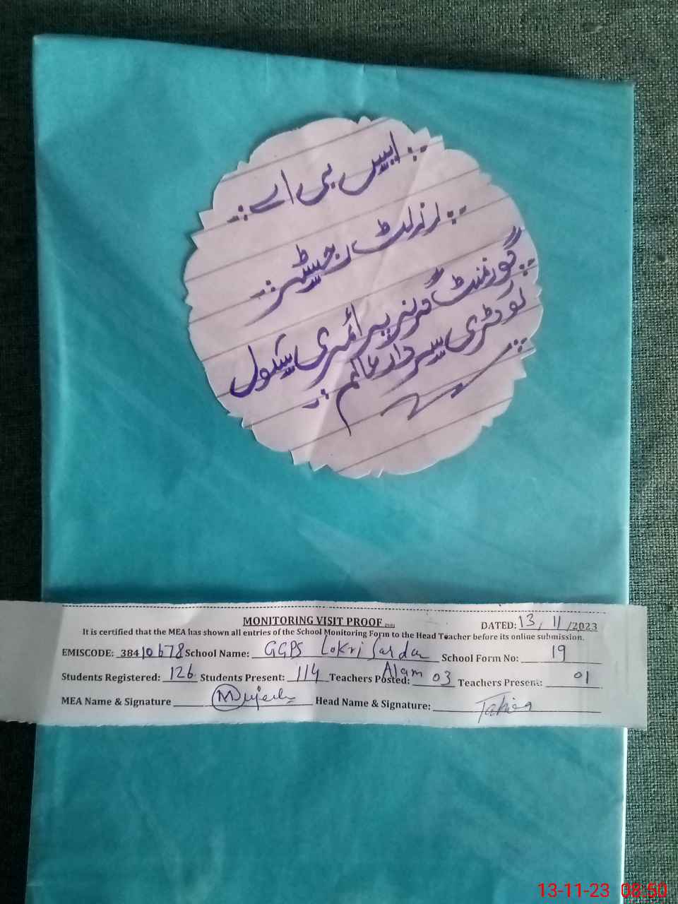 | EMIS Code: 38410678 | Name of School: GGPS LOKRI SARDAR ALAM | |||