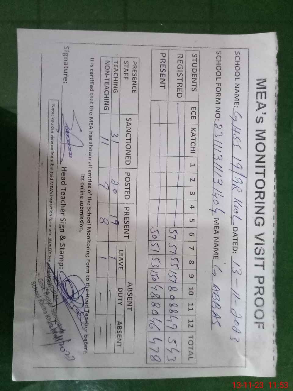 | Attendance Register | Head Teacher | MEA with School | Visit Proof |