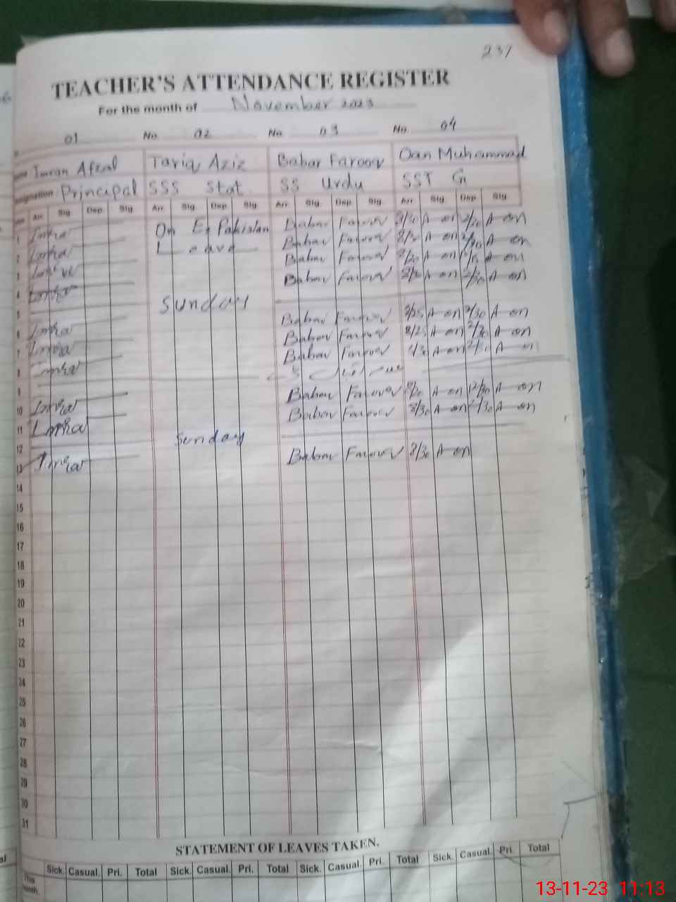 | Leave | Duty | Absent | Maternity | Medical | Ex- Pak |