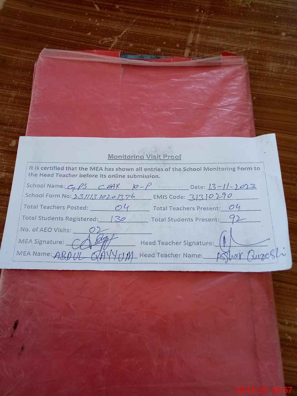 | EMIS Code: 31310290 | Name of School: GPS CHAK NO.10/P | |||