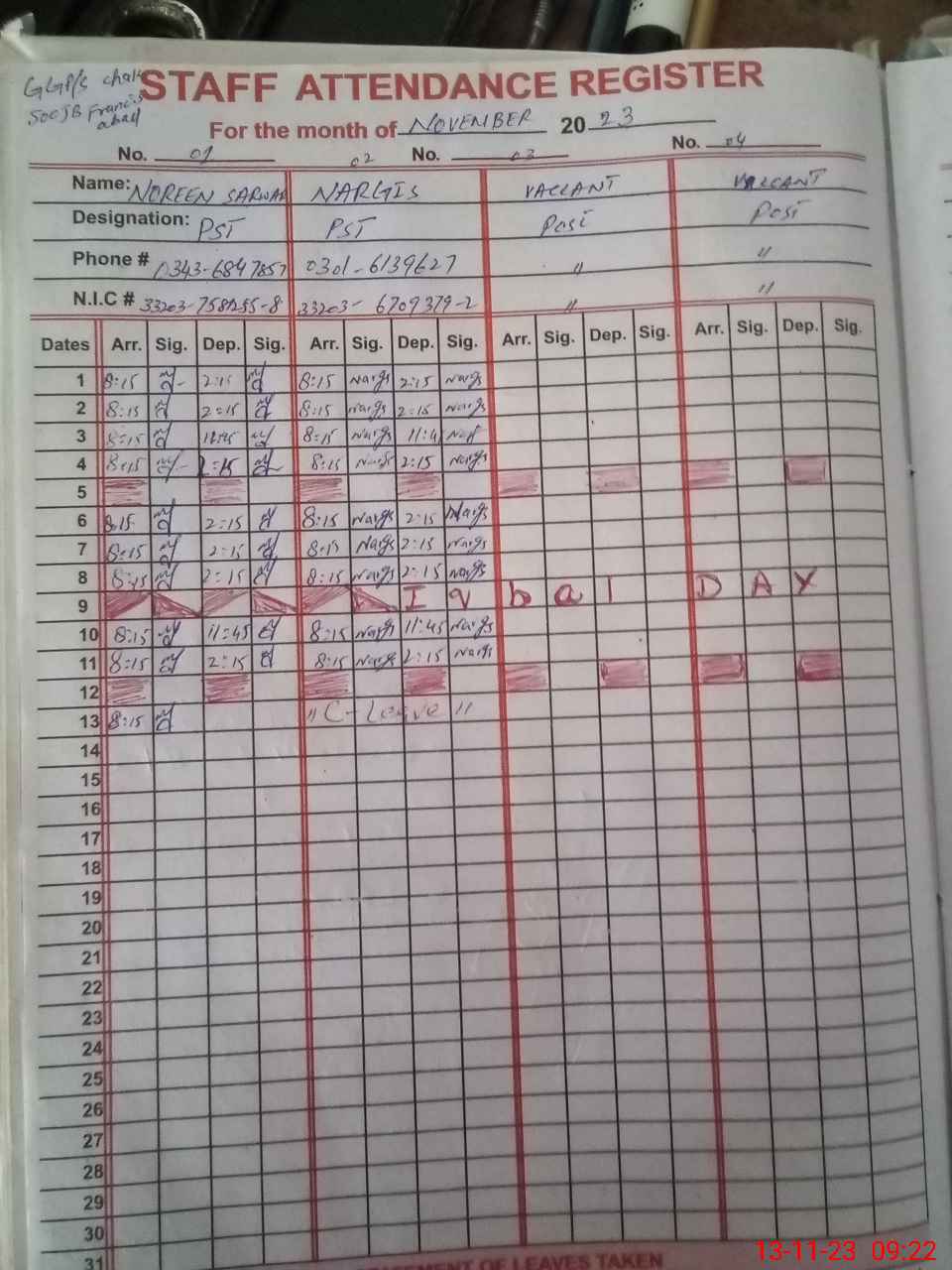 | CNIC | Full Name | Designation | R/C | Absence During Last Calender Month |