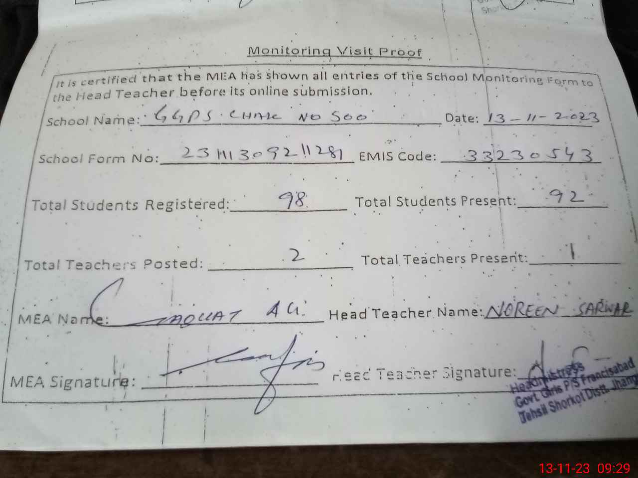 | Attendance Register | Head Teacher | MEA with School | Visit Proof |