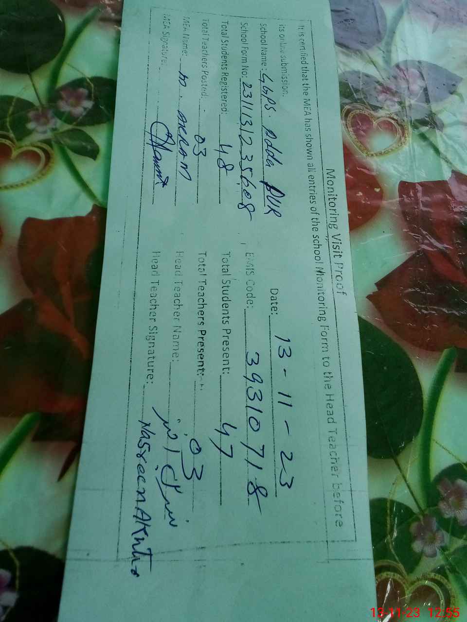 | Attendance Register | Head Teacher | MEA with School | Visit Proof |