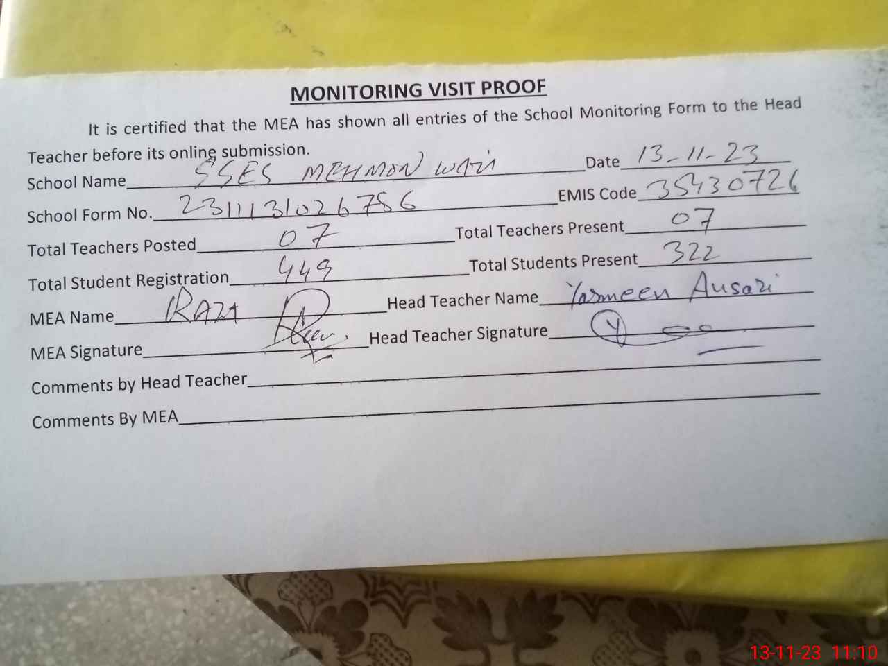 | Attendance Register | Head Teacher | MEA with School | Visit Proof |