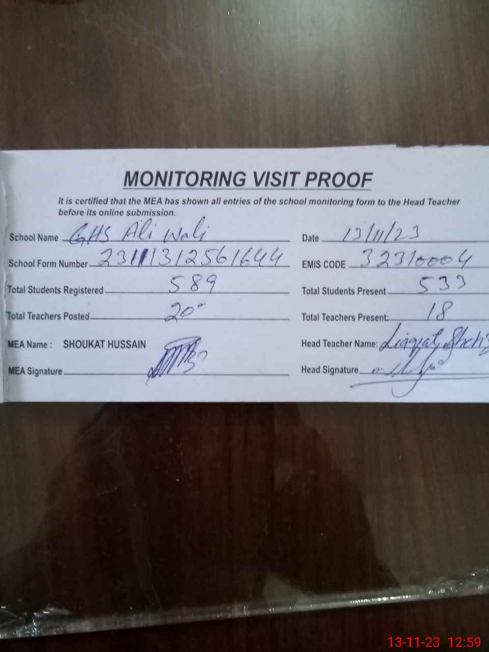 | Attendance Register | Head Teacher | MEA with School | Visit Proof |
