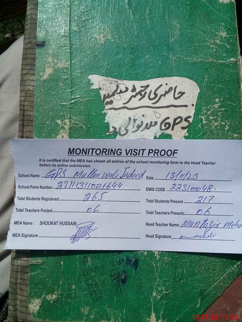 | Attendance Register | Head Teacher | MEA with School | Visit Proof |