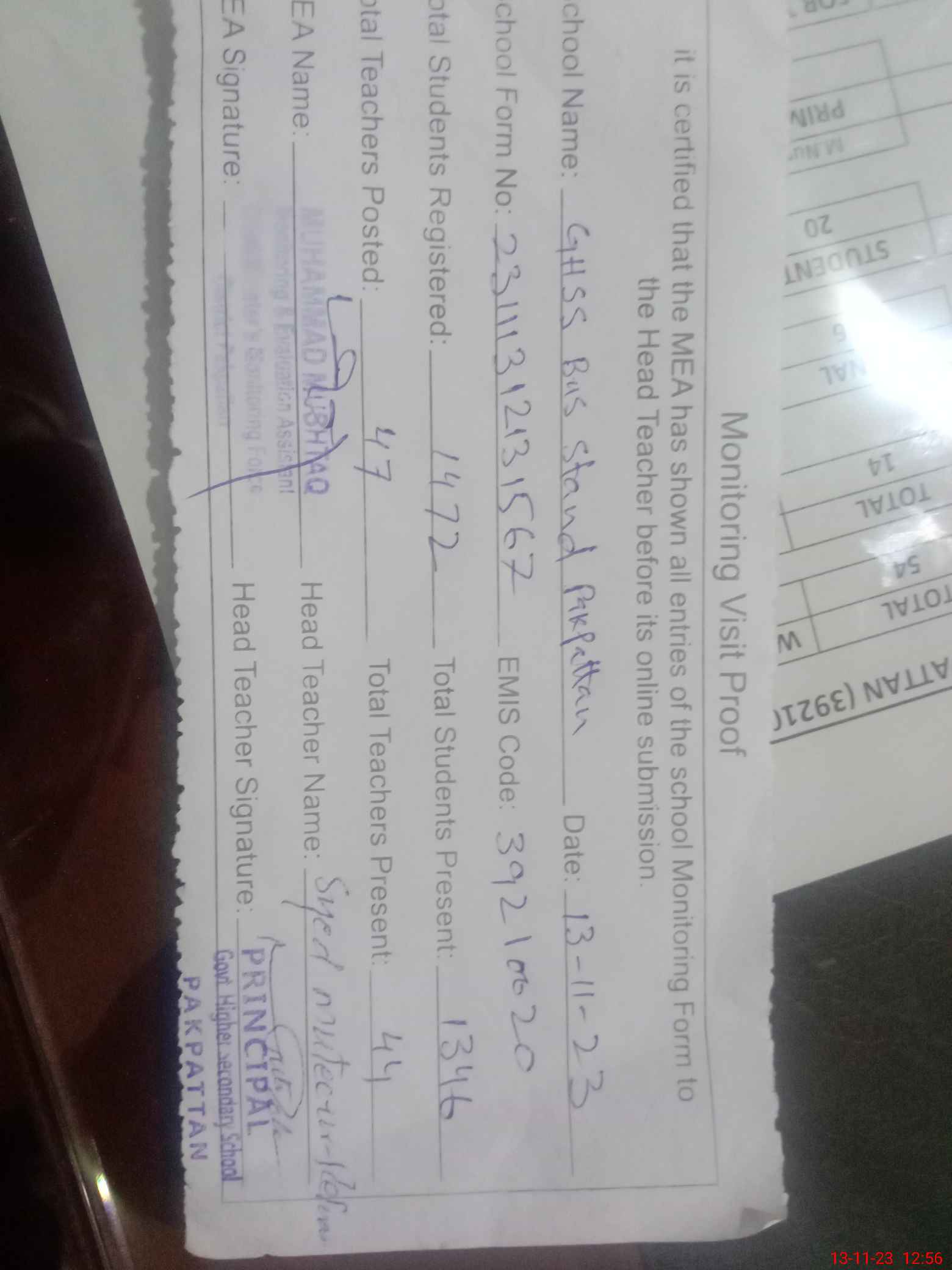 | Attendance Register | Head Teacher | MEA with School | Visit Proof |