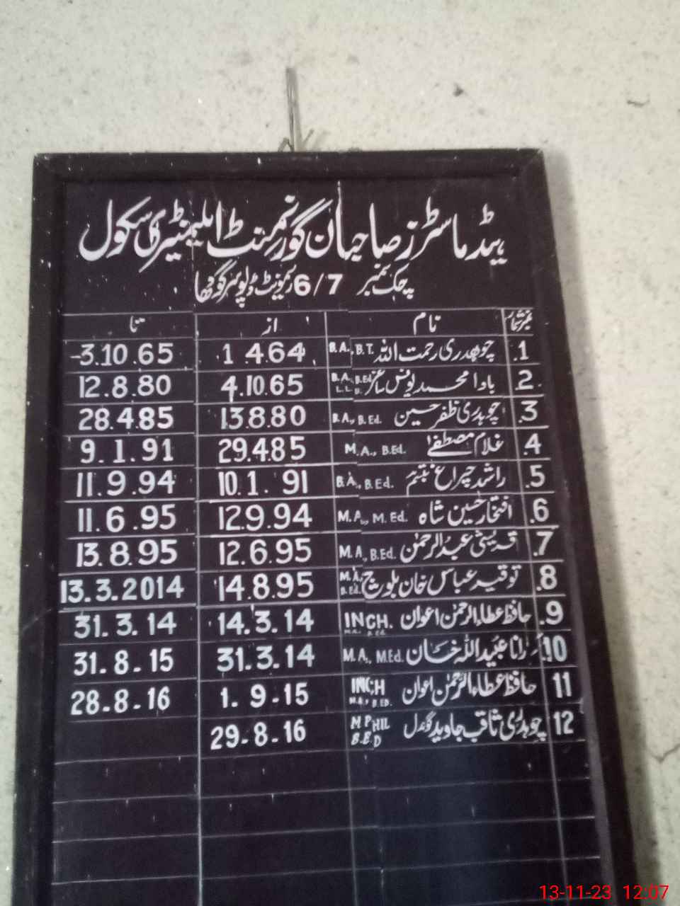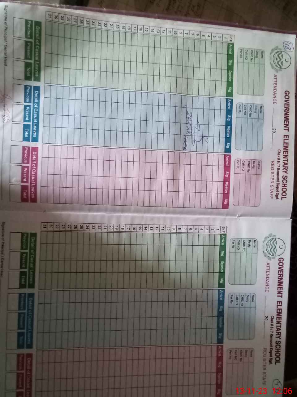 | Name: Zu**** Al**** Designation: (School Headmaster's/Headmistress's) Incharge Phone/Cell Number: 03**** |