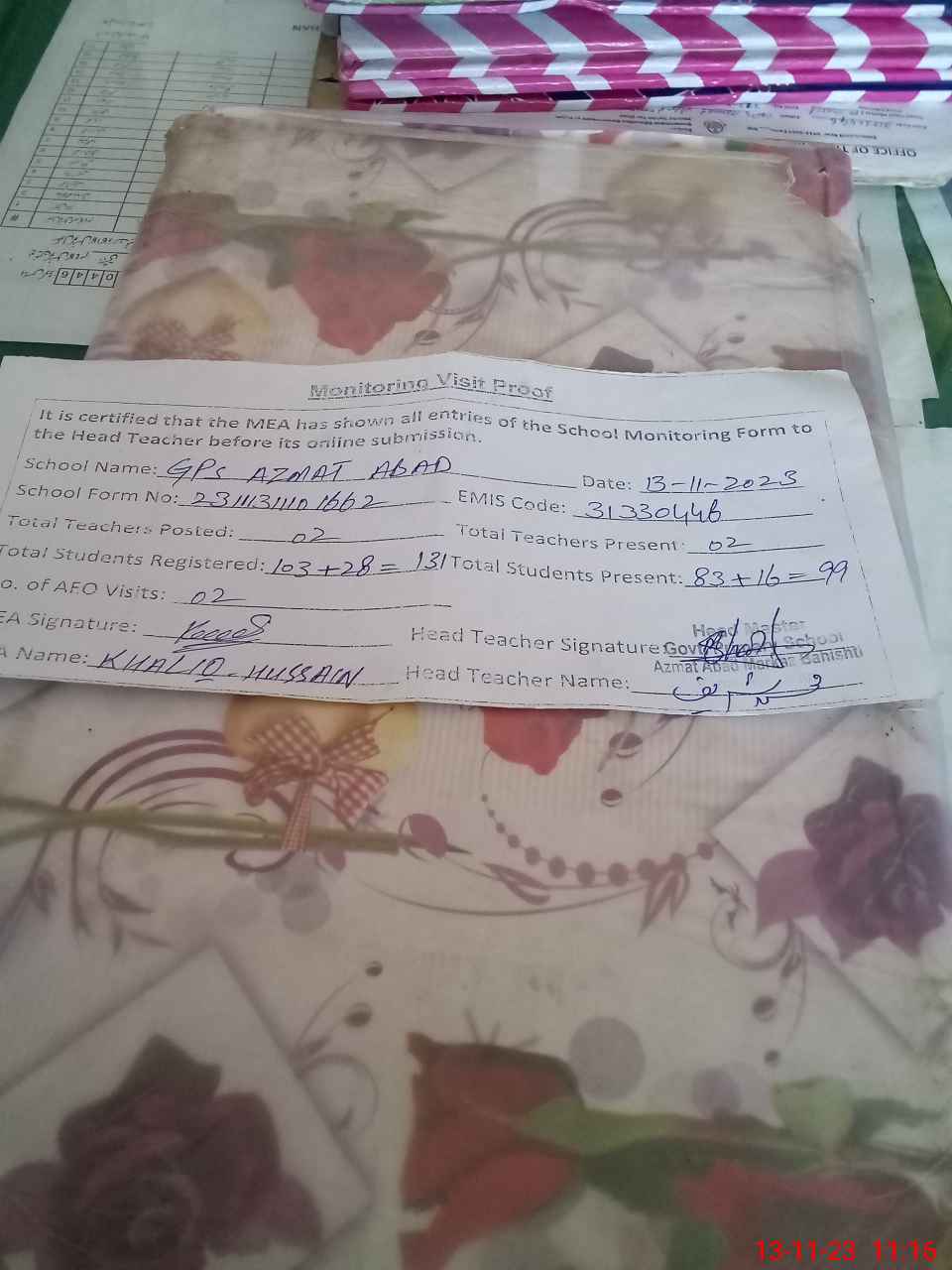 | EMIS Code: 31330446 | Name of School: GPS AZMAT ABAD | |||