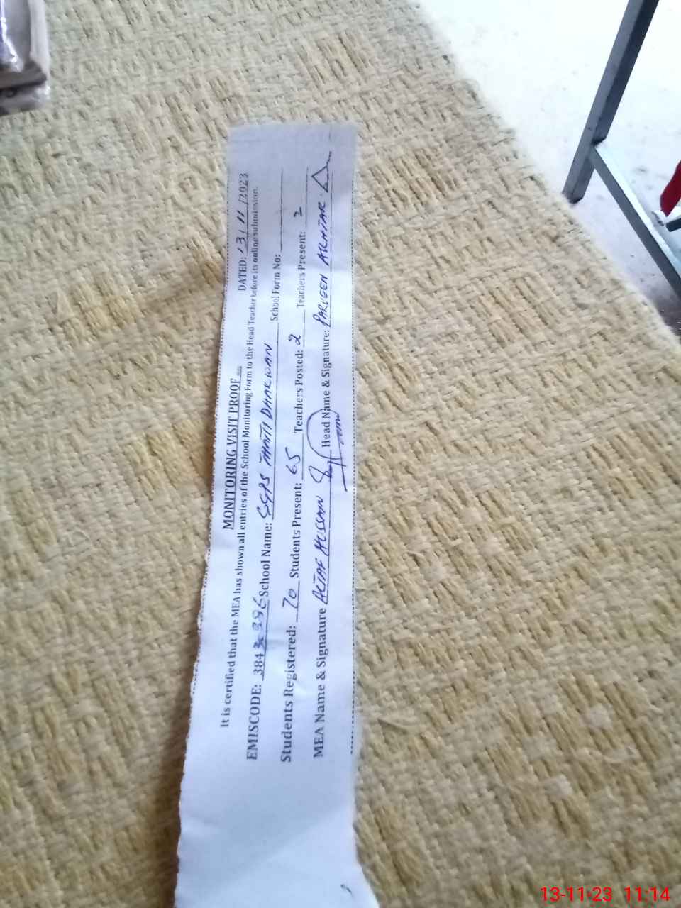 | Attendance Register | Head Teacher | MEA with School | Visit Proof |