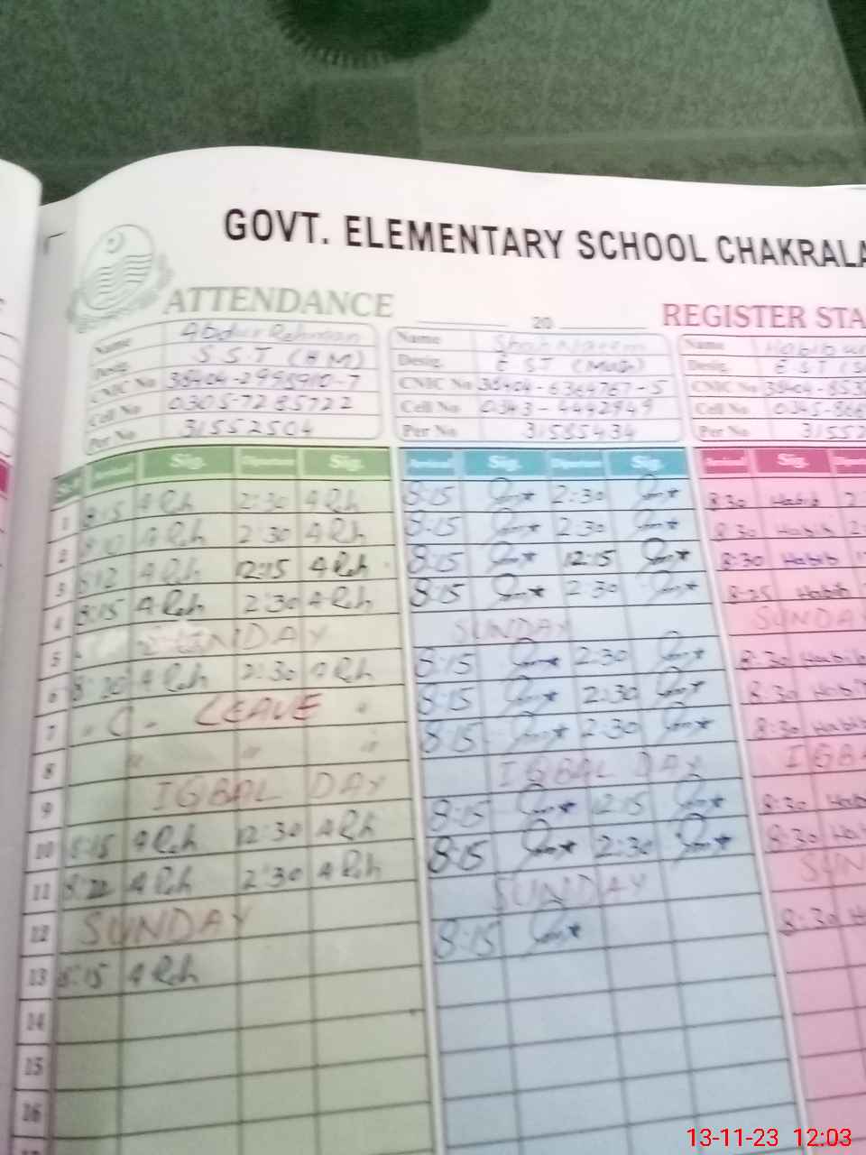 | CNIC | Full Name | Designation | R/C | Absence During Last Calender Month |