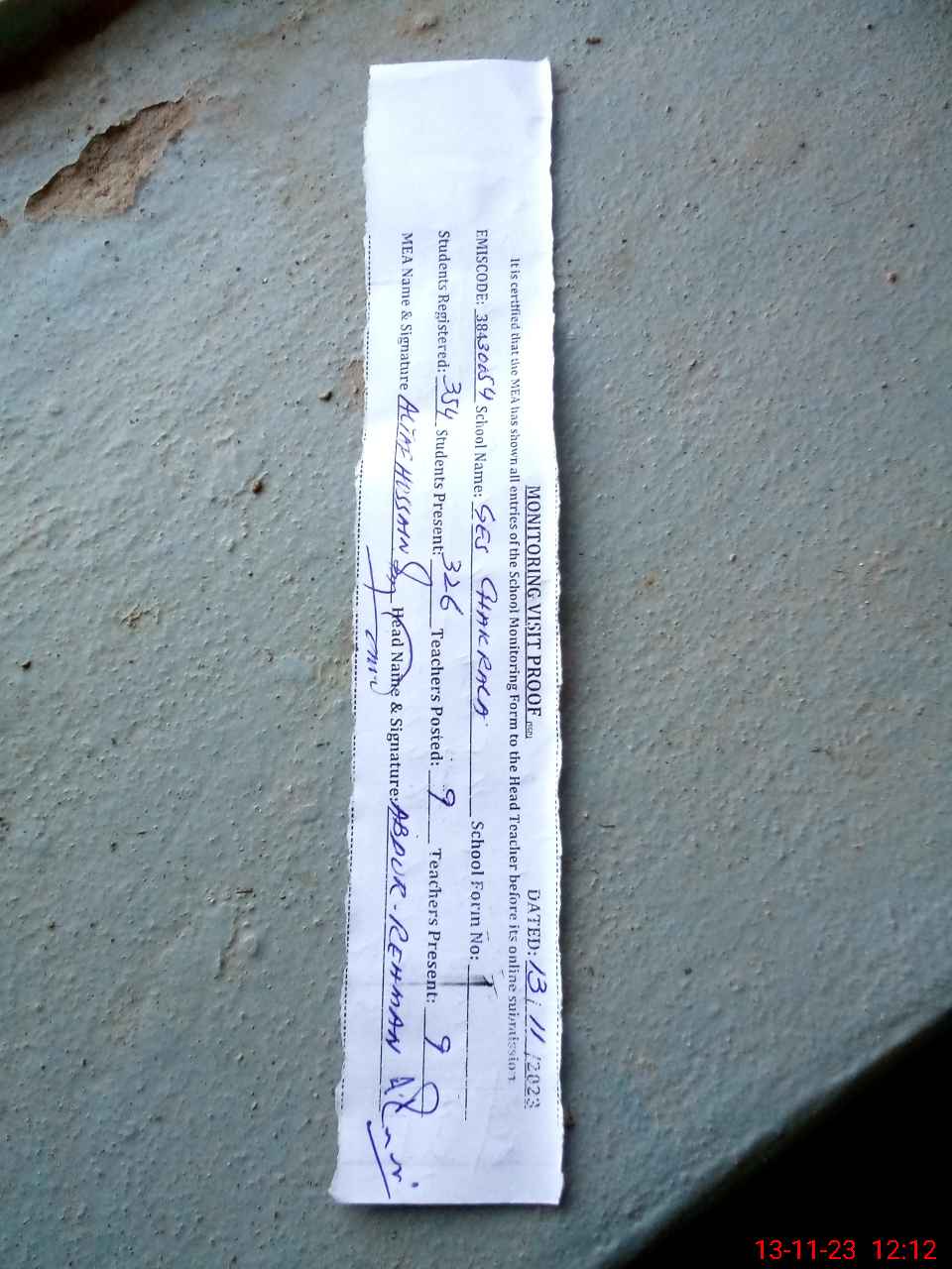 | Attendance Register | Head Teacher | MEA with School | Visit Proof |