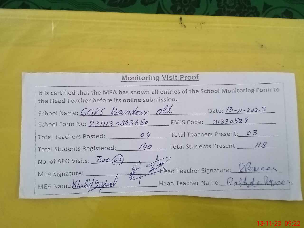 | Attendance Register | Head Teacher | MEA with School | Visit Proof |