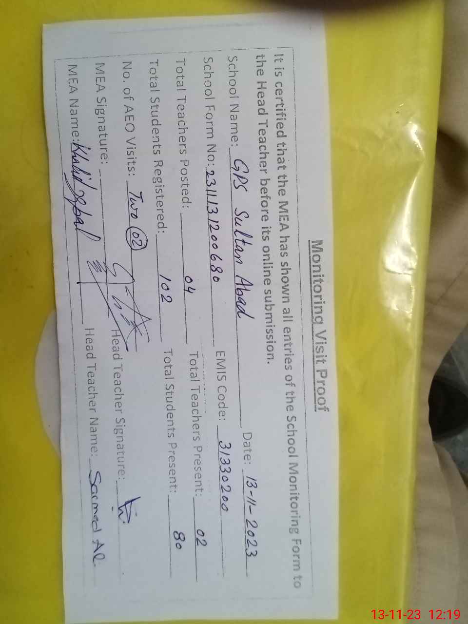 | Attendance Register | Head Teacher | MEA with School | Visit Proof |