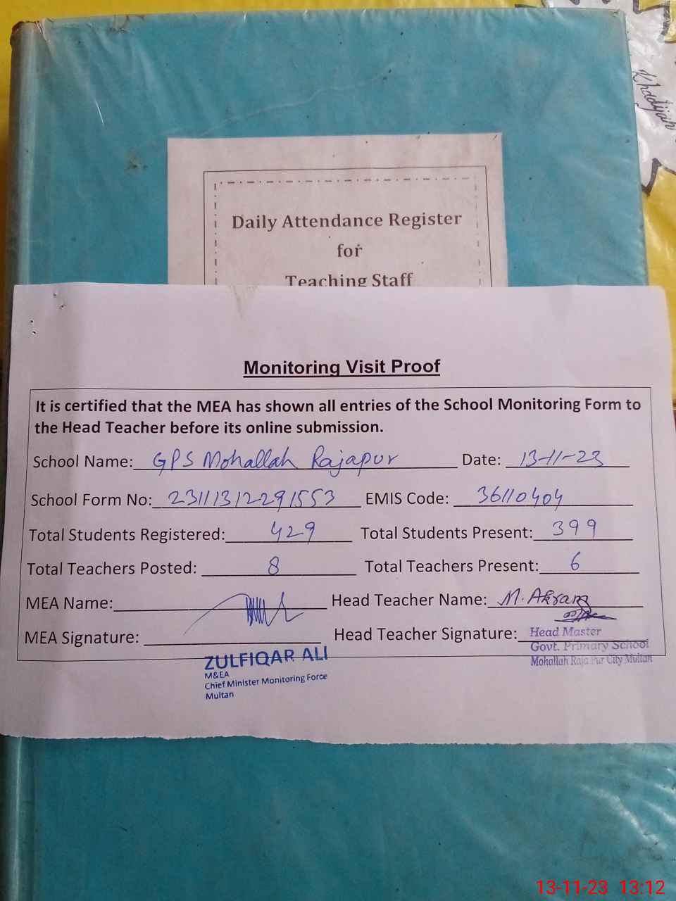 | Attendance Register | Head Teacher | MEA with School | Visit Proof |