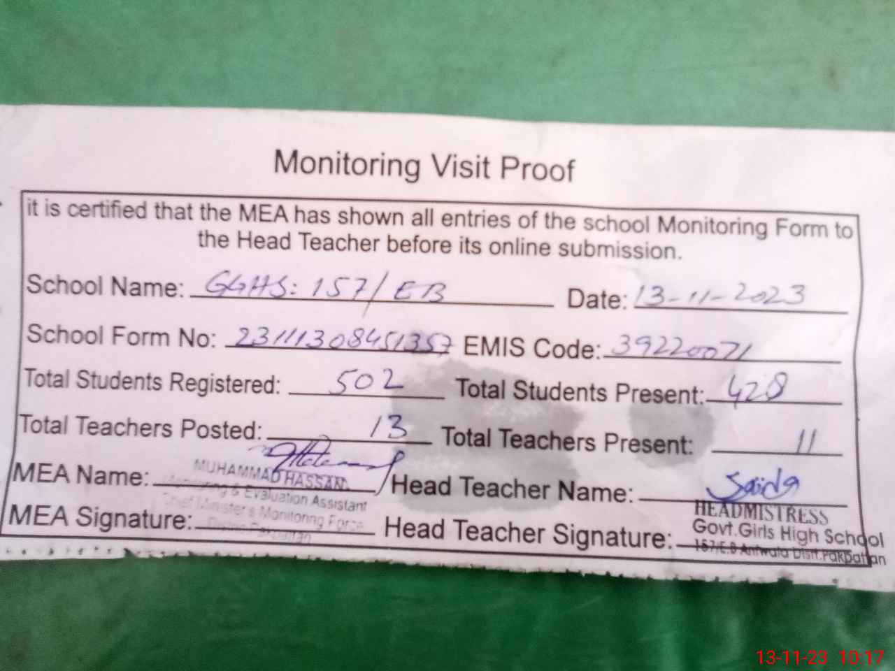 | EMIS Code: 39220071 | Name of School: GGHS CHAK NO. 157 EB | |||