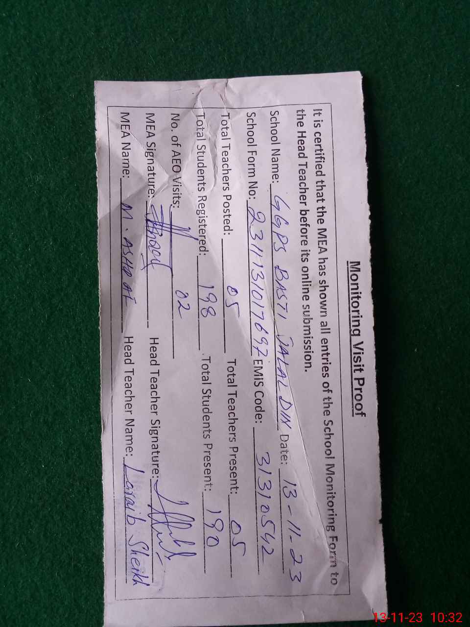 | Attendance Register | Head Teacher | MEA with School | Visit Proof |