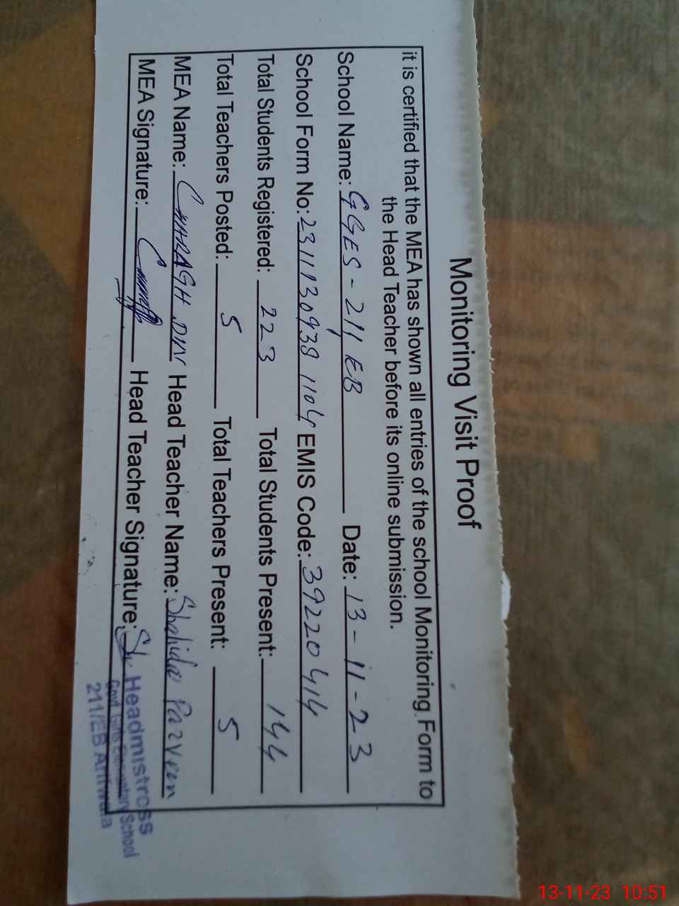 | Attendance Register | Head Teacher | MEA with School | Visit Proof |