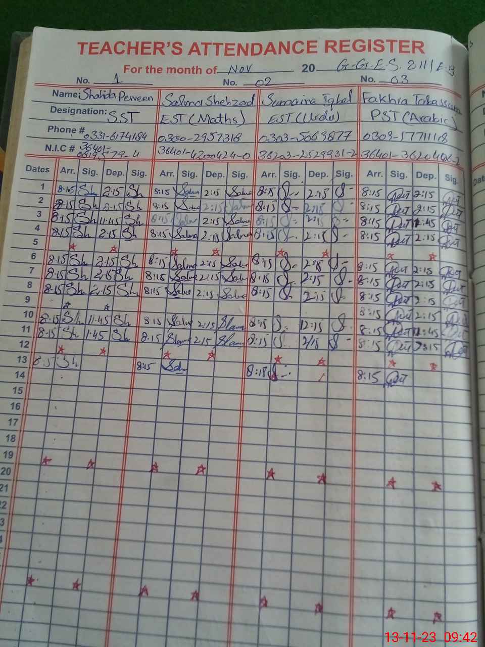 | CNIC | Full Name | Designation | R/C | Absence During Last Calender Month |