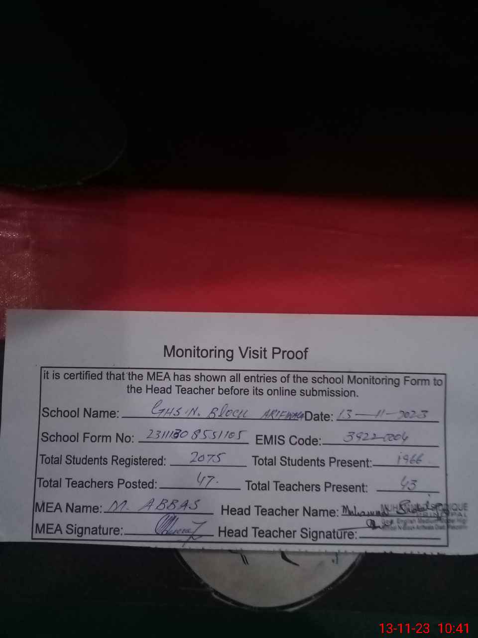 | Attendance Register | Head Teacher | MEA with School | Visit Proof |
