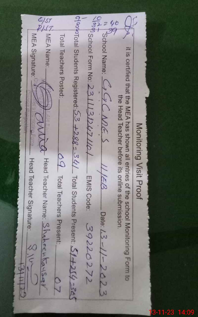 | EMIS Code: 39220272 | Name of School: GGCMES 11 EB P/O PIR SADAR DIN | |||