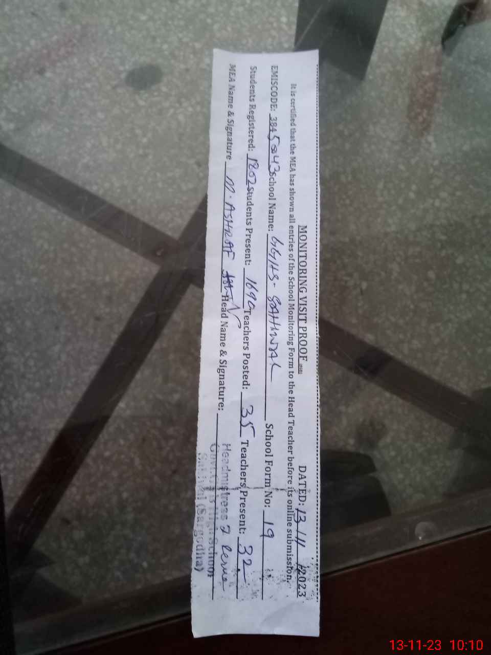 | Monitoring Date: 13-11-2023 | Start Time: 13-11-2023 09:23 AM | End Time: 13-11-2023 10:13 AM | Name of MEA: MU**** AS**** (R**** | |