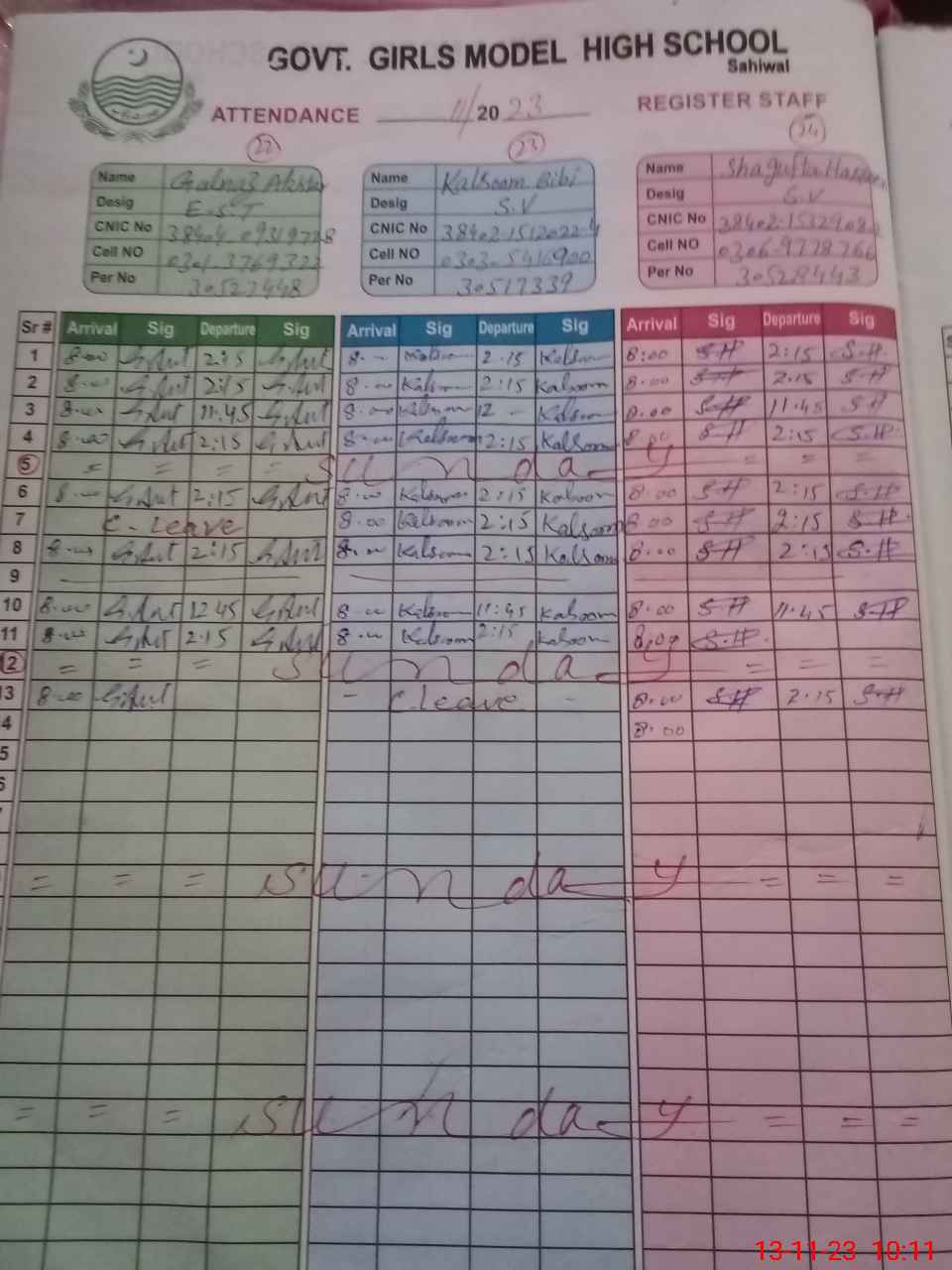| CNIC | Full Name | Designation | R/C | Absence During Last Calender Month |