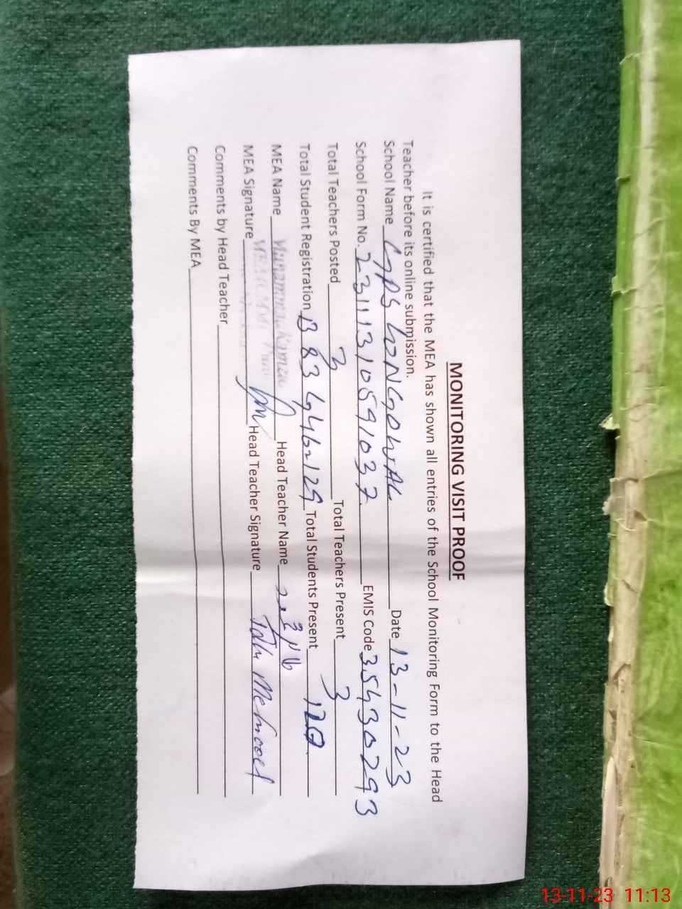 | Attendance Register | Head Teacher | MEA with School | Visit Proof |