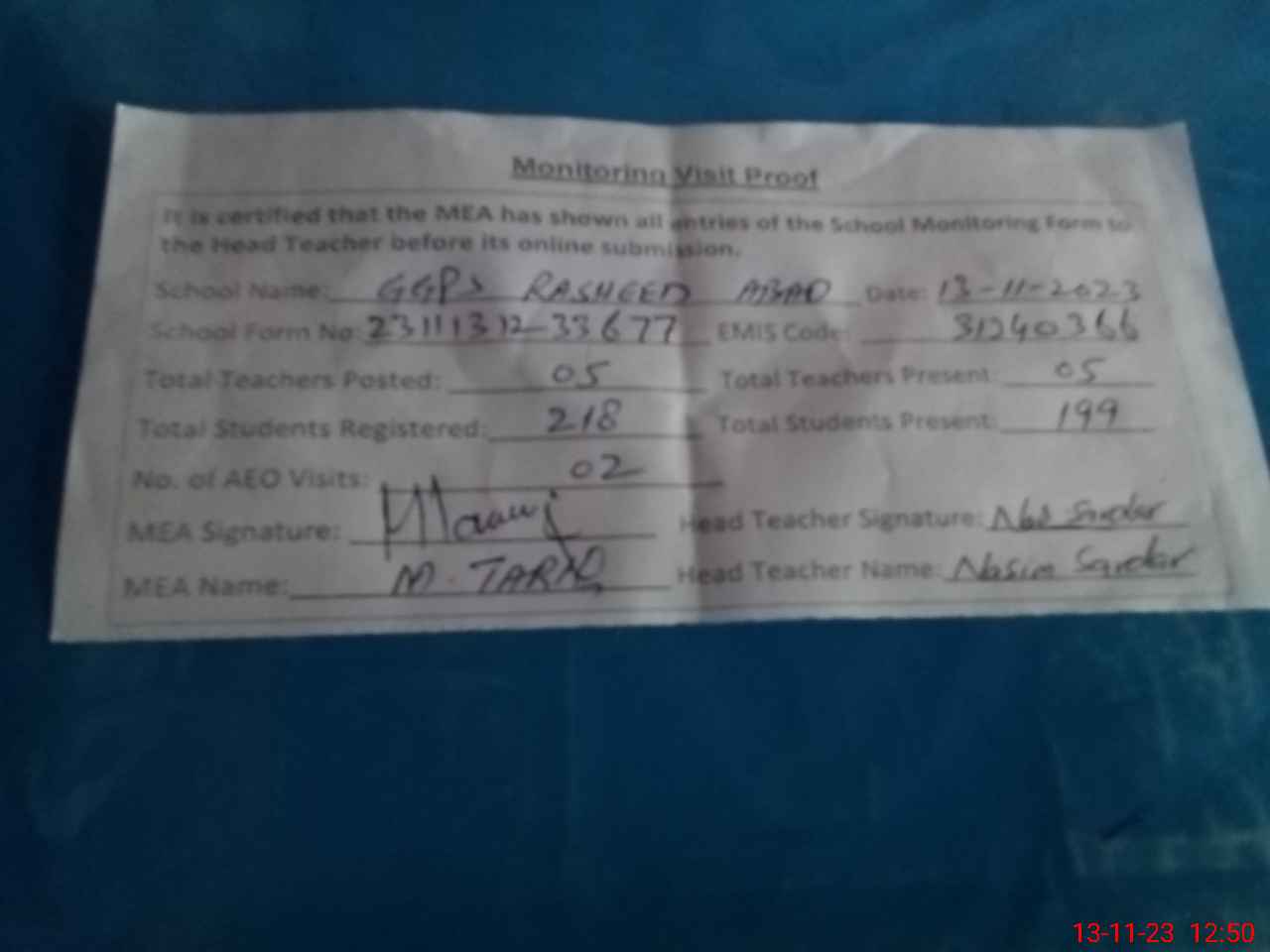 | Attendance Register | Head Teacher | MEA with School | Visit Proof |