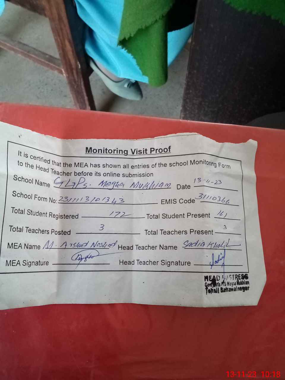 | Attendance Register | Head Teacher | MEA with School | Visit Proof |