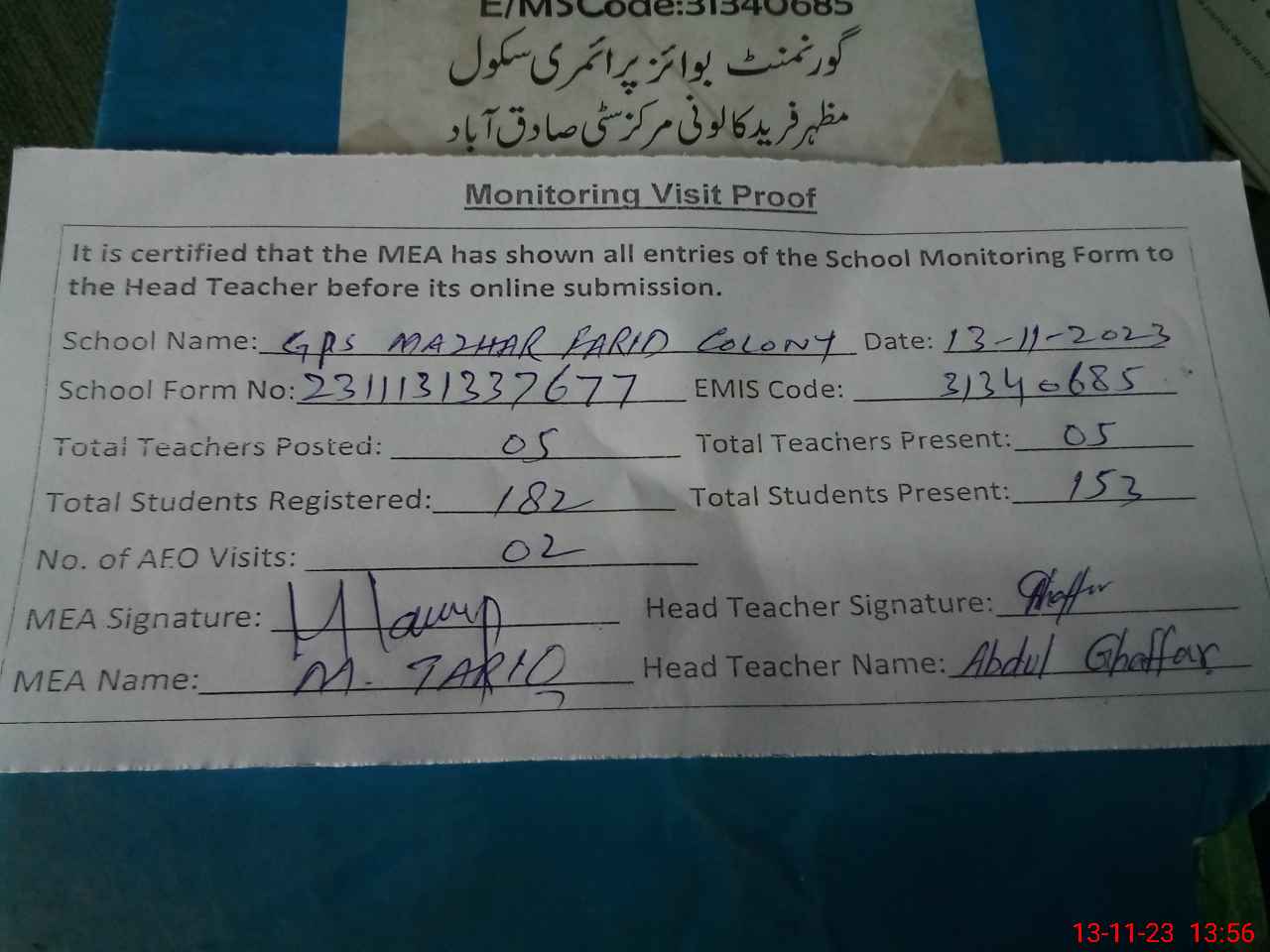 | EMIS Code: 31340685 | Name of School: GPS MAZHAR FARID COLONY | |||