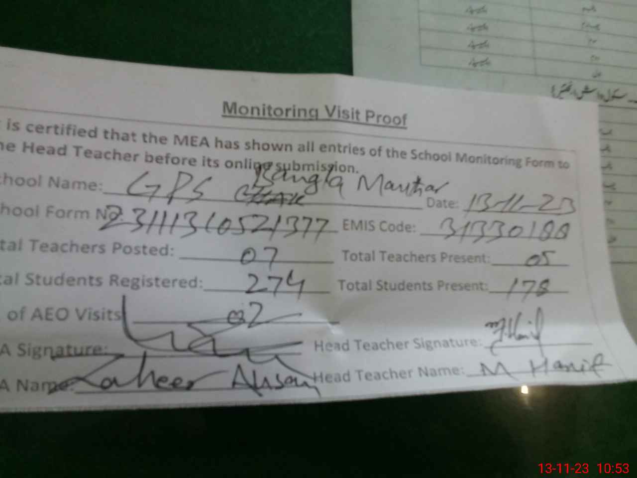 | Monitoring Date: 13-11-2023 | Start Time: 13-11-2023 10:23 AM | End Time: 13-11-2023 11:06 AM | Name of MEA: Za**** Ah**** | |