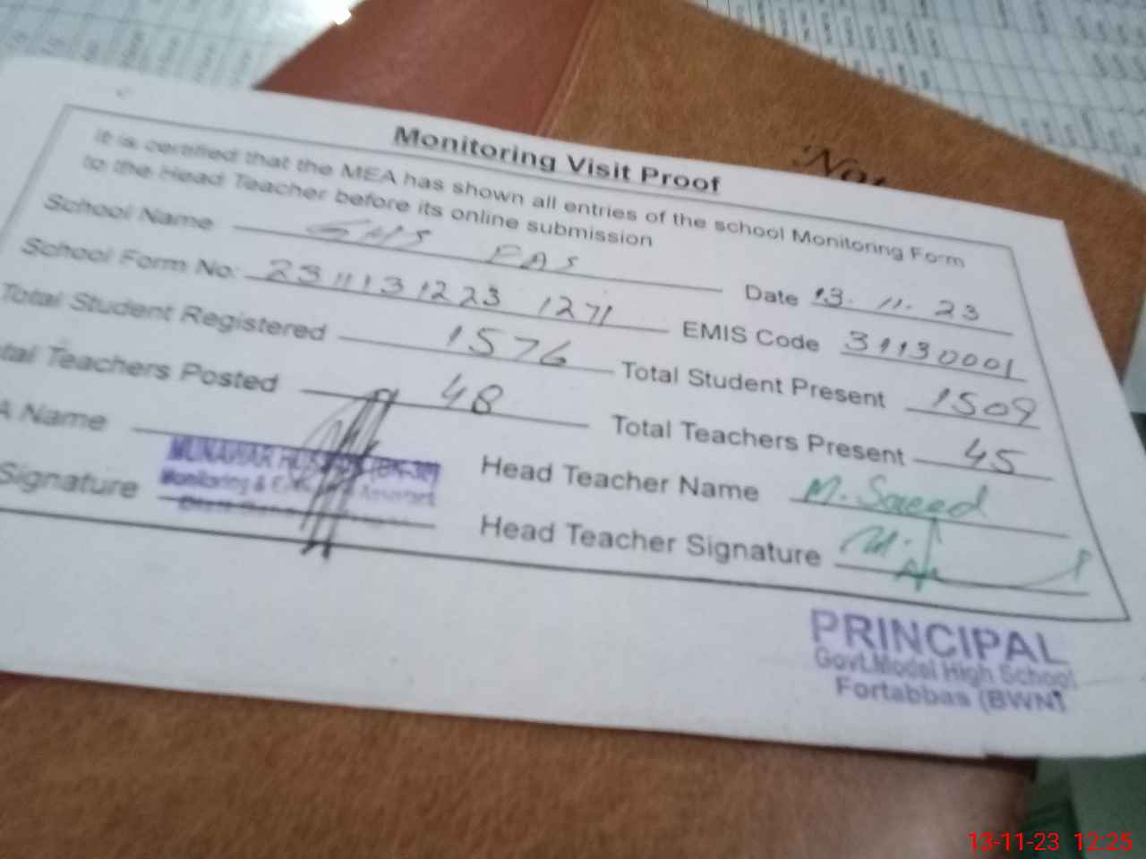 | Attendance Register | Head Teacher | MEA with School | Visit Proof |