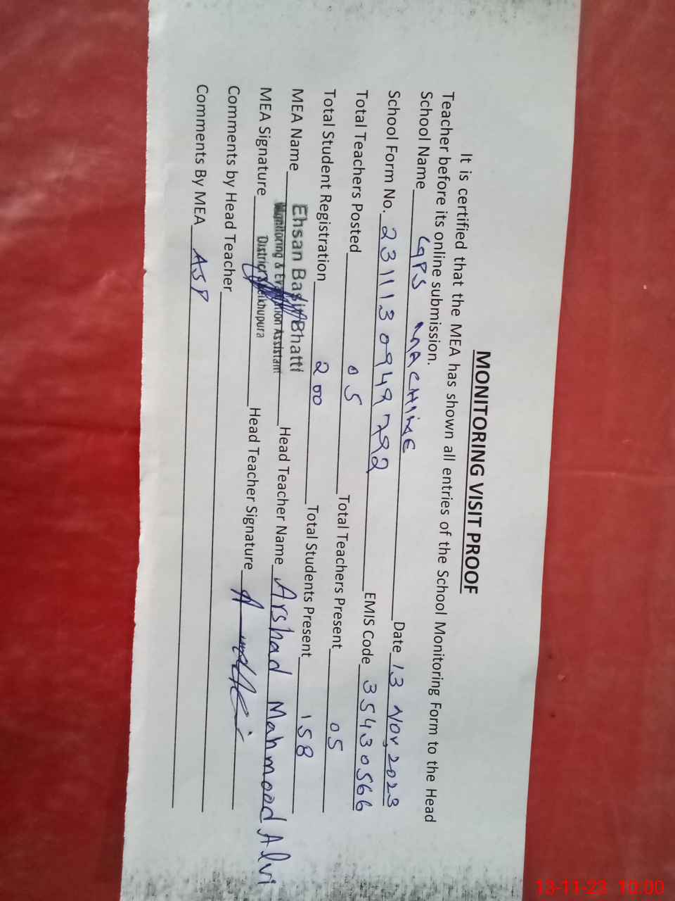 | Attendance Register | Head Teacher | MEA with School | Visit Proof |