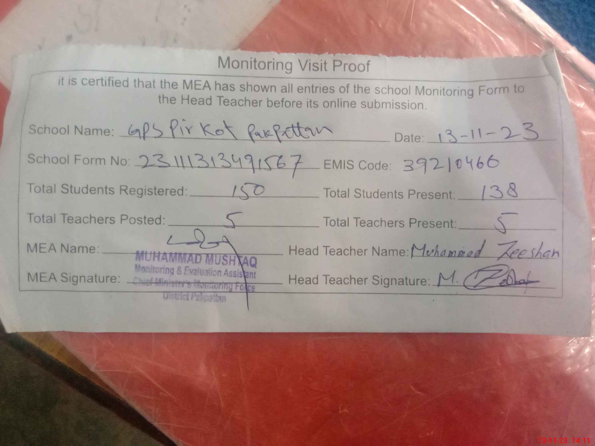 | Attendance Register | Head Teacher | MEA with School | Visit Proof |