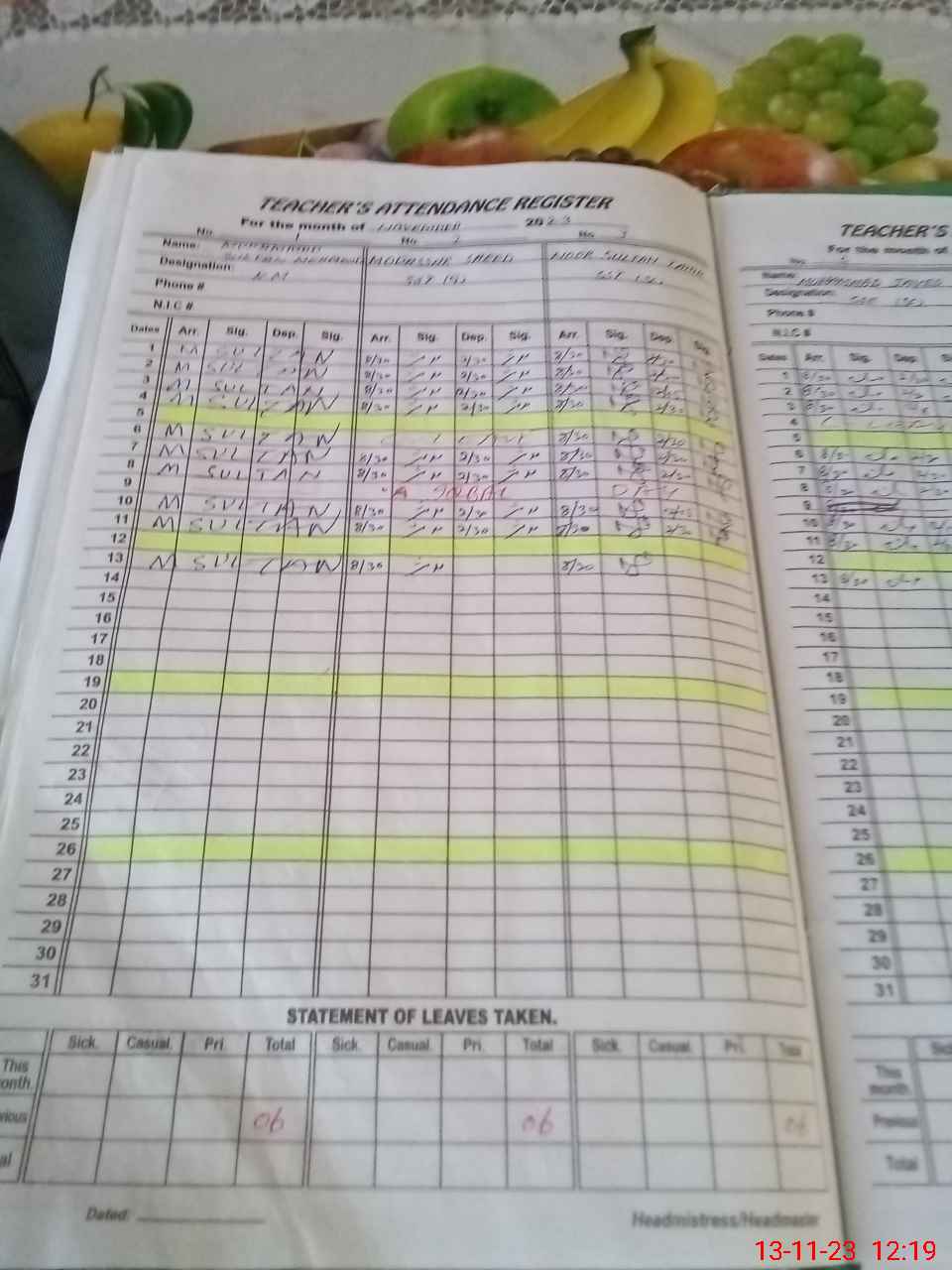 | CNIC | Full Name | Designation | R/C | Absence During Last Calender Month |