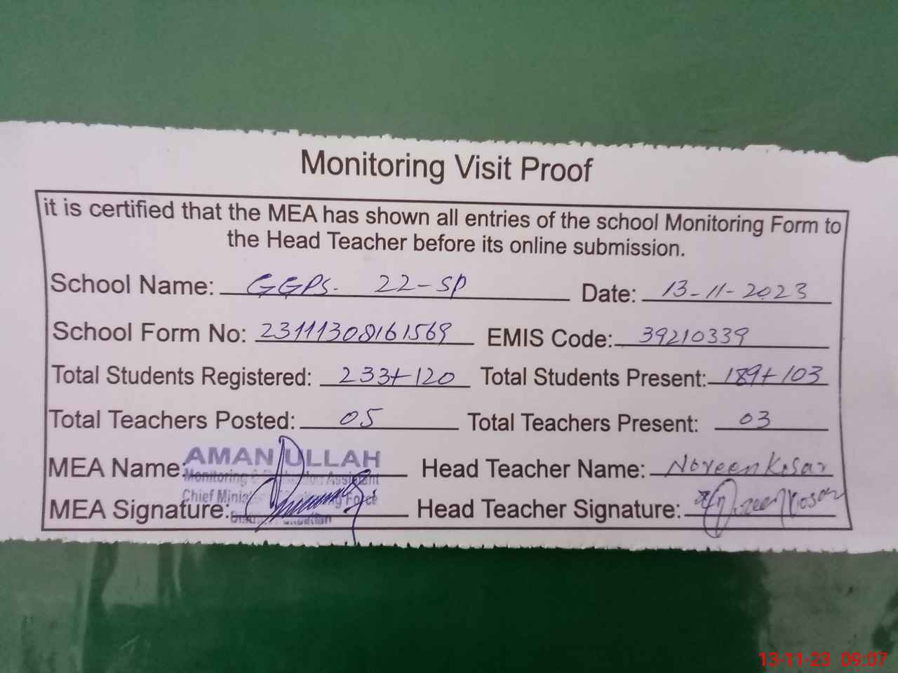 | Attendance Register | Head Teacher | MEA with School | Visit Proof |