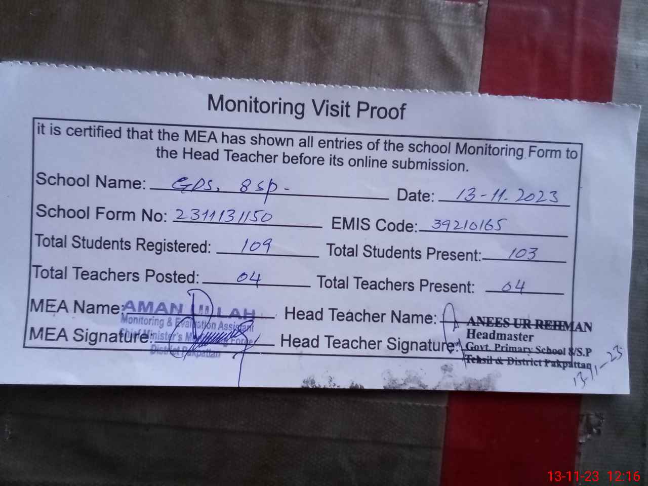 | Attendance Register | Head Teacher | MEA with School | Visit Proof |