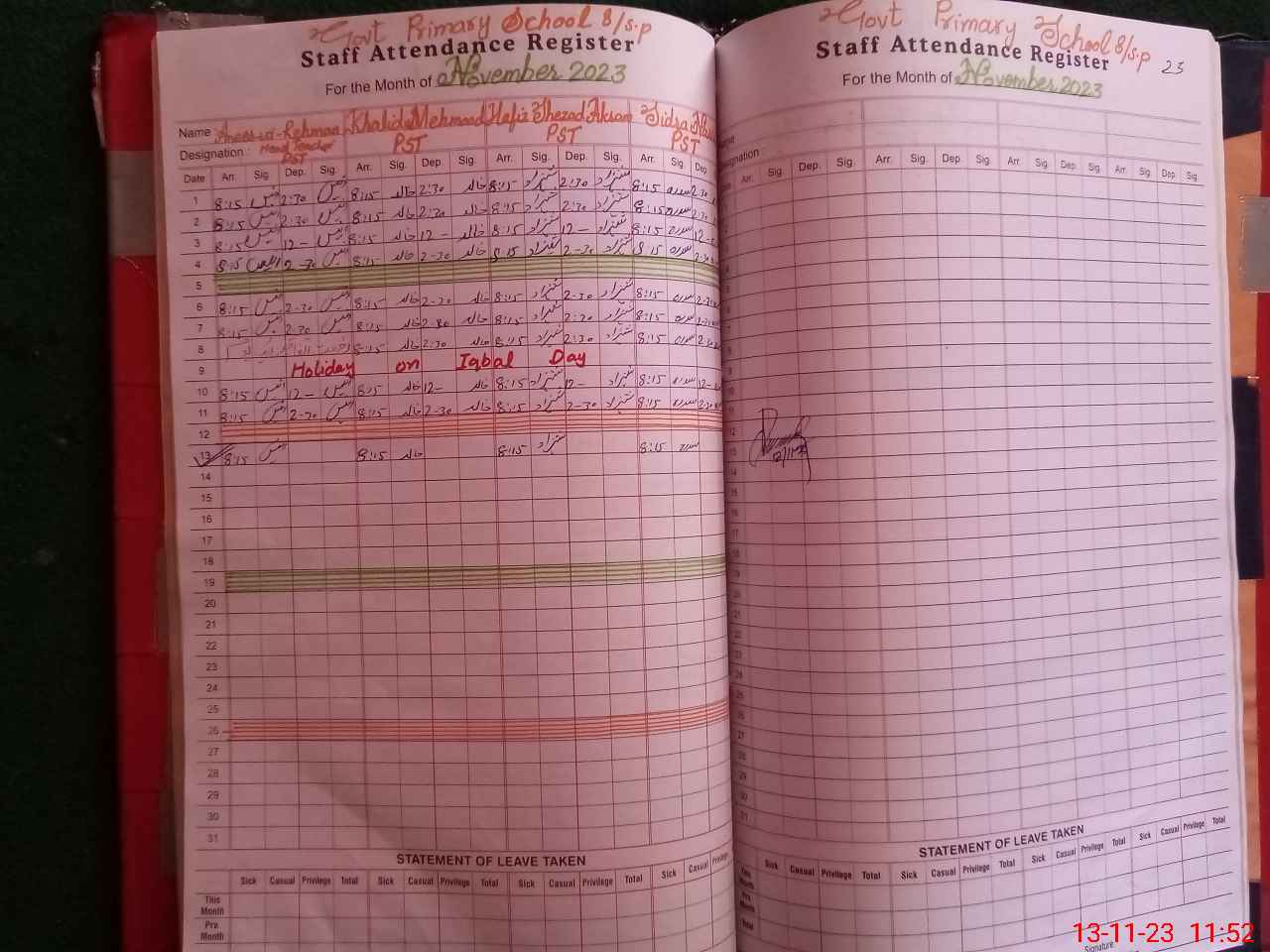 | CNIC | Full Name | Designation | R/C | Absence During Last Calender Month |