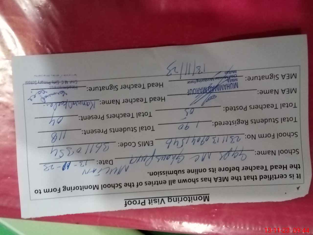 | Attendance Register | Head Teacher | MEA with School | Visit Proof |