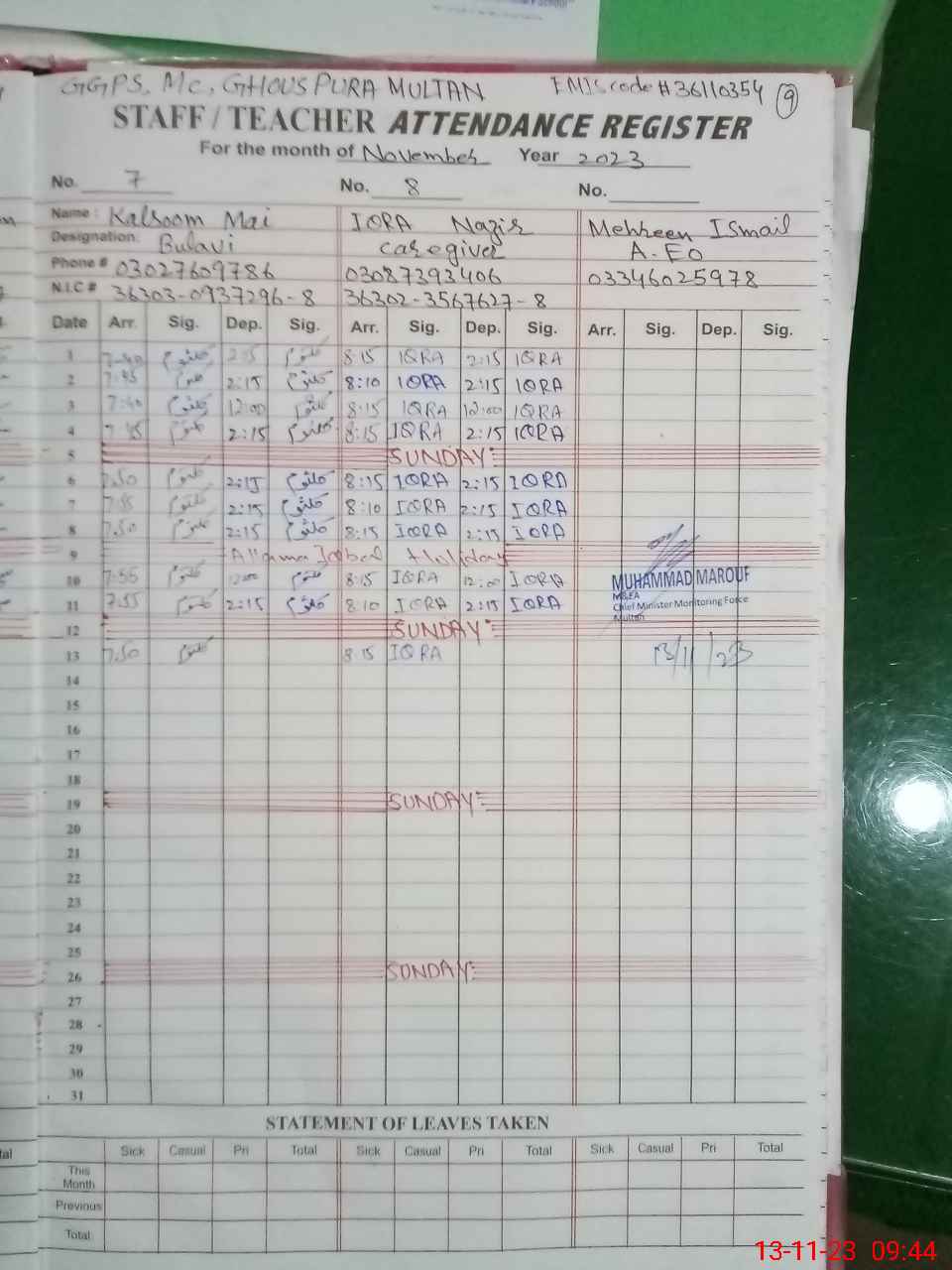 | Monitoring Date: 13-11-2023 | Start Time: 13-11-2023 09:04 AM | End Time: 13-11-2023 09:45 AM | Name of MEA: Mu**** Ma**** | |