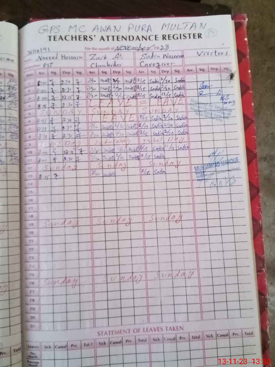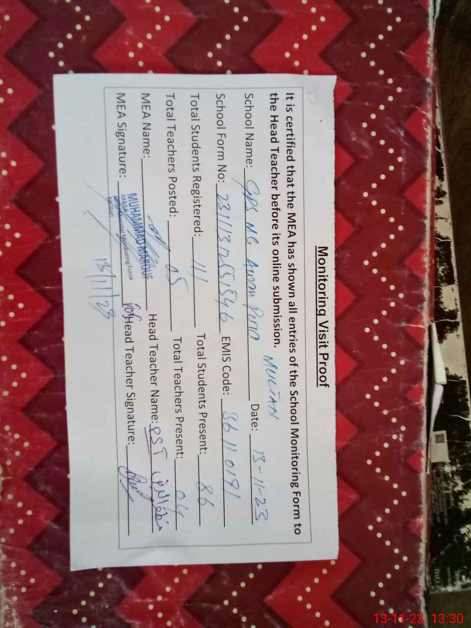 | Attendance Register | Head Teacher | MEA with School | Visit Proof |
